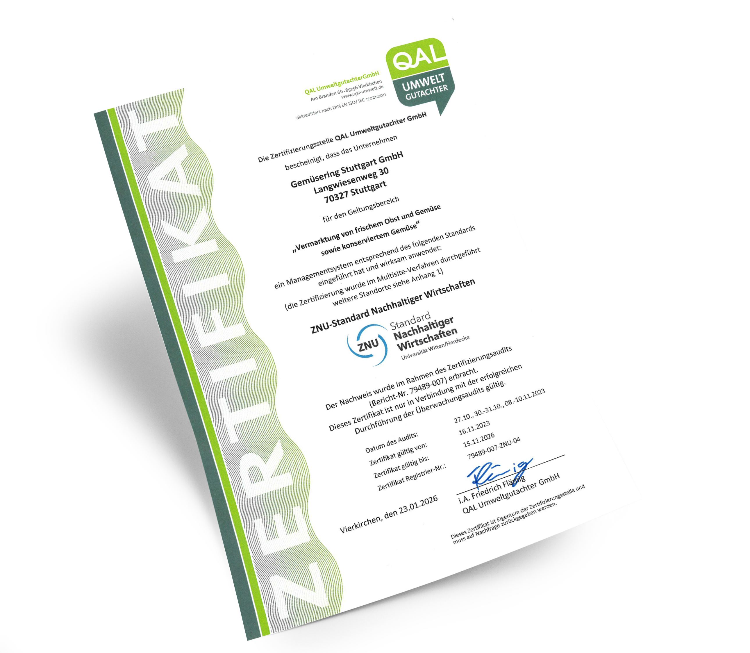 Als Teil der Gemüsering-Gruppe unterstützen wir die zentralen Nachhaltigkeits-Ziele des Gemüsering Stuttgart und verfolgen diese, soweit möglich, auch am eigenen Standort. Um dieses Engagement zu unterstreichen, wurde unser Unternehmen 2020 in die Zertifizierung des Gemüsering Stuttgart nach dem ZNU-Standard Nachhaltiger Wirtschaften eingebunden. Mehr über Nachhaltigkeit in der Gemüsering-Gruppe erfahren.